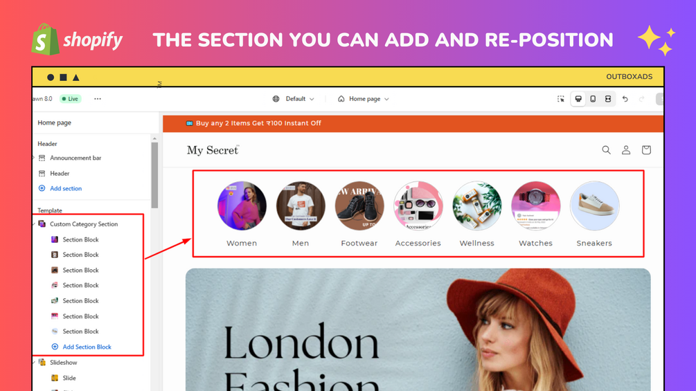 Easy 2 minutes-2 steps installation process of this 'Shopify custom category code' into your Shopify theme, allowing you to add the section anywhere you want and display categories/offers and other information with clickable links.